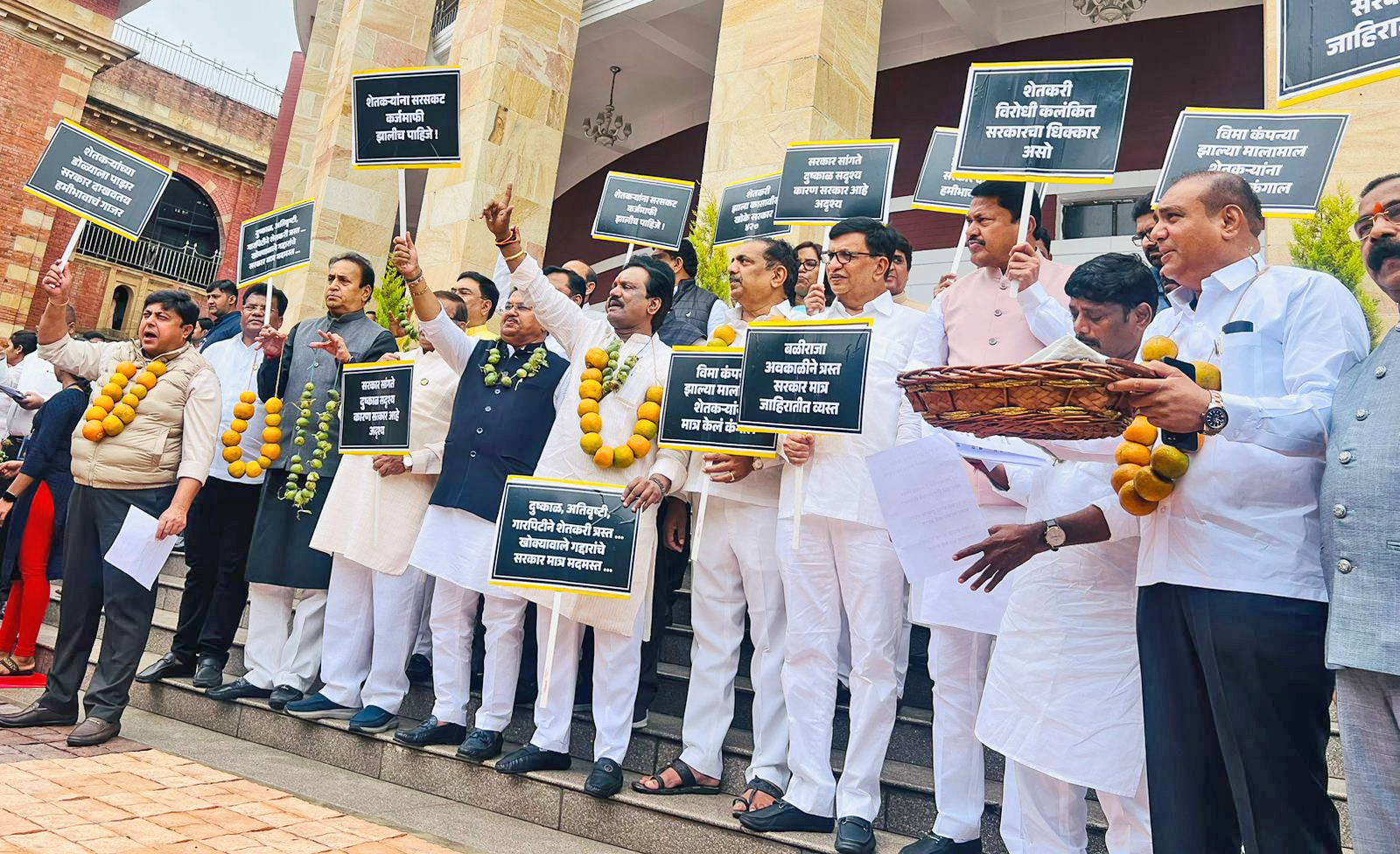 हिवाळी अधिवेशनच्या पहिल्या दिवशी शेतकऱ्यांना सरसकट कर्जमाफी, शेतमालाला भाव, दुष्काळग्रस्तभागात निधी वाटप आदी मागण्या करत महाविकास आघाडीने आमदारांनी विधिमंडळाच्या पायऱ्यांवर सरकारविरोधात जोरदार घोषणाबाजी केली. शेतकऱ्यांच्या हक्कासाठी सुपारी, संत्र्यांची प्रतिकात्मक माळ गळ्यात घालून हे आंदोलन करण्यात आले.