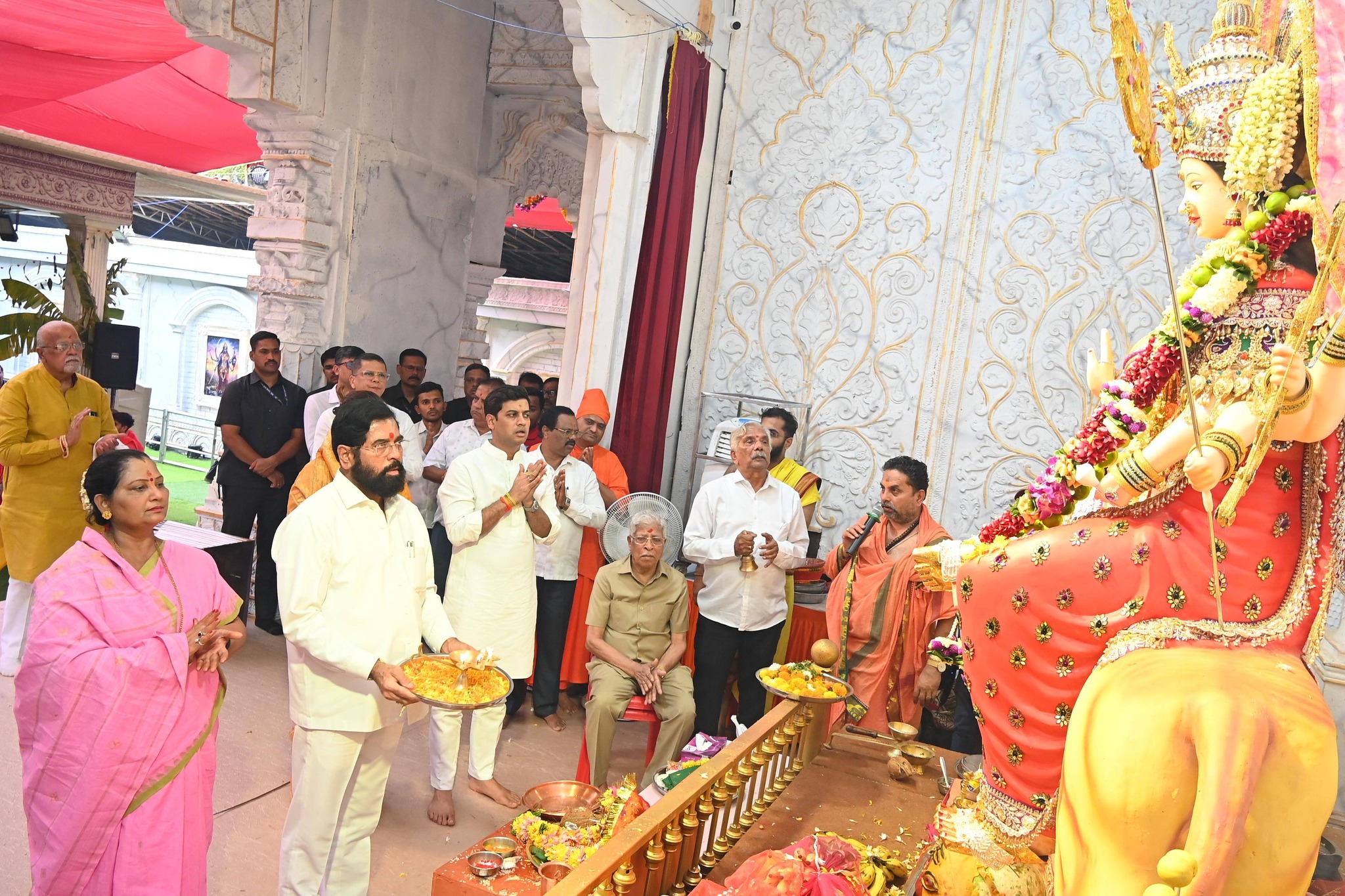 ठाणे पूर्वेकडील तुकाराम मैदानात धर्मवीर आनंद दिघे प्रतिष्ठानच्या वतीने आयोजित करण्यात आलेल्या चैत्र नवरात्रोत्सव सोहळ्यात आज दशमीच्या दिवशी सहस्त्रचंडी होमाचे आयोजन करण्यात आले होते. यावेळी उपमुख्यमंत्री एकनाथ शिंदे यांनी सहकुटुंब सहपरिवार सहभागी होऊन विधिवत पूजन केले. तसेच यानंतर देवीची आरती करून तिचे आर्शिवाद घेतले. यावेळी त्यांचे वडील संभाजी शिंदे, खासदार डॉ.श्रीकांत शिंदे, पत्नी लता शिंदे, सून वृषाली श्रीकांत शिंदे, शिवसेना सचिव संजय मोरे, प्रकाश कोटवानी, विलास जोशी तसेच शिवसेना पदाधिकारी, शिवसैनिक उपस्थित होते.