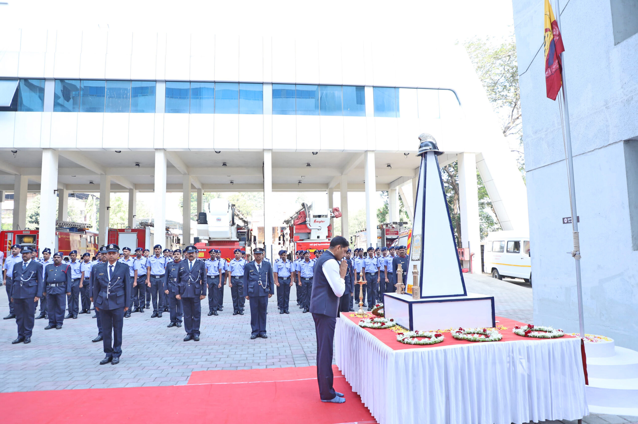 नवी मुंबई : अग्निविमचनाचे काम करीत असताना आपल्या प्राणांचे बलिदान करणाऱ्या शहीदांचा सन्मान ठेवणे हे आपले कर्तव्य असून त्यांच्या स्मृतींपासून अधिक चांगले काम करण्याची ऊर्जा मिळते असे सांगत नमुंमपा आयुक्त डॉ. कैलास शिंदे यांनी शहीद अग्निशमन जवानांच्या स्मृतीस्तंभास पुष्पचक्र अर्पण करीत भावपूर्ण आदरांजली दिली. नवी मुंबई महानगरपालिका अग्निशमन दलाच्या वतीने वाशी अग्निशमन केंद्रात अग्निशमन दिनानिमित्त आयोजित कार्यक्रमाप्रसंगी आयुक्तांनी उपस्थित अग्निशमन जवानांशी संवाद साधला.