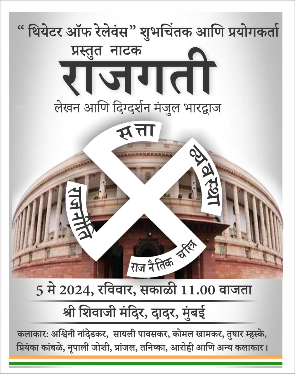 अस्मिता आणि प्रतिष्ठा या शब्दांनी भ्रमाचे जाळे पसरवले जात आहे. पण त्याऐवजी ‘सत्य, अहिंसा आणि संविधान’ हा भारताचा वैचारिक आणि तर्कशुद्ध कणा म्हणजे भारतीयता आहे. हे भारताच्या लोकांनो, जागे होऊया आणि संविधान जपुया. राजकारण म्हणजे केवळ सत्ता मिळवणे, निवडणुका घेणे किंवा संसदेत वाद-विवाद करणे नव्हे, तर मानवतेच्या सर्वांगीण कल्याणासाठी जनतेची आणि राज्यकर्त्यांची चेतना जागृत करण्याची प्रक्रिया आहे. ‘थिएटर ऑफ रेलेव्हन्स शुभचिंतक आणि अभ्यासक’ रंगचिंतक मंजुल भारद्वाज लिखित – दिग्दर्शित नाटक ‘राजगती’ रविवारी ५ मे रोजी सकाळी ११ वाजता श्री शिवाजी नाट्यमंदिर दादर येथे प्रस्तुत करणार आहेत.