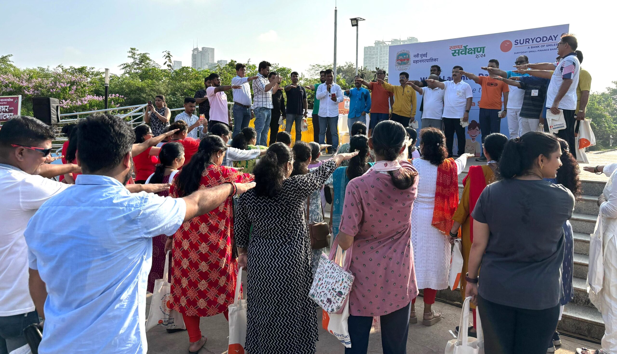 असाच एक अभिनव उपक्रम जागतिक हास्य दिनाचे औचित्य साधून नवी मुंबई महानगरपालिका आणि सुर्योदय स्मॉल फायनान्स बँक यांच्या संयुक्त विद्यमाने नेरूळ सेक्टर 26 येथील बहुचर्चित ज्वेल ऑफ नवी मुंबई या शहरातील आकर्षणस्थळी सकाळी 7 वाजता अतिरिक्त आयुक्त श्री. सुनिल पवार यांच्या प्रमुख उपस्थितीत राबविण्यात आला.
