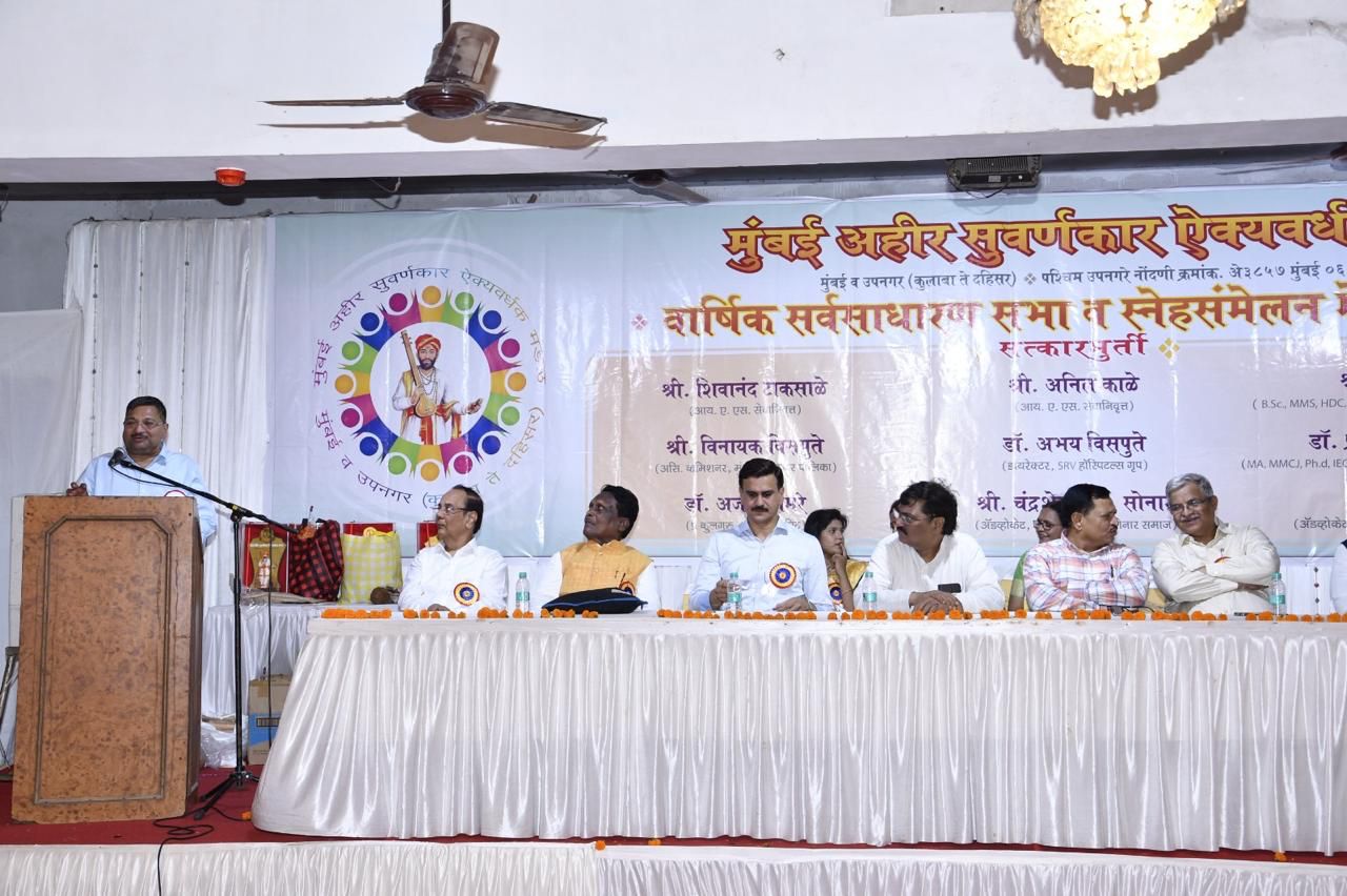 रविवार दि.१२ मे रोजी मुंबई अहिर सुवर्णकार ऐक्यवर्धक मंडळाचे वार्षिक सर्वसाधारण सभा आणि स्नेहसंमेलनाचे आयोजन महात्मा गांधी हाँल ,एस व्ही रोड ,तलावाजवळ ,वांद्रे (पश्चिम) मुंबई येथे करण्यात आले होते. याप्रसंगी प्रमुख पाहुणे म्हणून शिवानंद टाकसाळे ( आयएएस सेवानिवृत्त), विनायक विसपुते (असि. कमिश्नर मुंबई महापालिका), डॉ. अभय विसपुते (डायरेक्टर एस आर व्ही हॉस्पिटलस् ग्रुप्स्,), प्रा.श्रीकांत मुरलीधर सोनवणे (MA ,MMCJ , Ph.d.IEC. (डायरेक्टर, इंडियन इन्स्टिट्यूट ऑफ पब्लिक रिलेशन्स, पत्रकारिता महाविद्यालय नाशिक), डॉ अजय भामरे,( प्र कुलगुरू मुंबई विद्यापीठ), अँड.सी.डी.सोनार (मार्गदर्शक धुळे सोनार समाज),