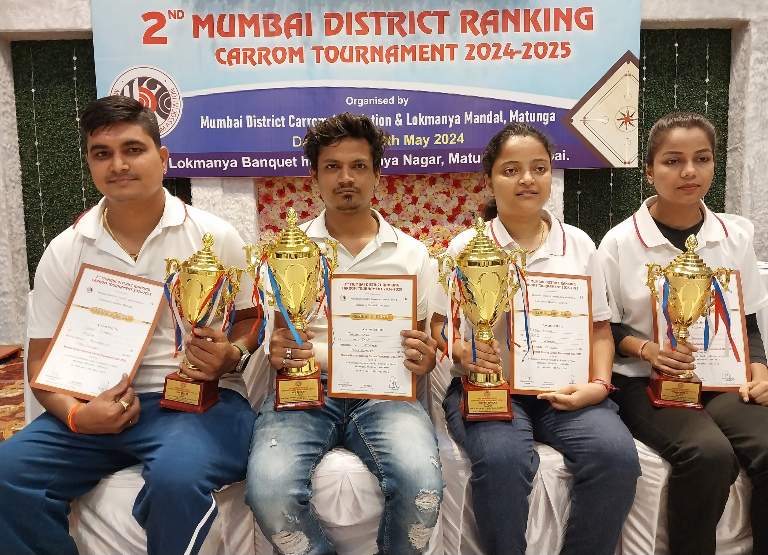 मुंबई : डिस्ट्रिक्ट कॅरम असोसिएशन व लोकमान्य मंडळ, माटुंगा यांच्या संयुक्त विद्यमाने लोकमान्य बँक्वेट हॉल, लोकमान्य नगर, माटुंगा ( पश्चिम ) येथे सुरु असलेल्या मुंबई जिल्हा मानांकन कॅरम स्पर्धेत पुरुष एकेरीच्या अंतिम सामन्यात शिवतारा कॅरम क्लबच्या फहिम काझीने मुंबई महानगरपालिकेच्या विकास धारियावर तीन सेटपर्यंत रंगलेल्या लढतीत ०-२५, २०-१०, २५-११ असे नमवून विजेतेपद पटकाविले. तर दुसरीकडे आपल्या अनुभवाच्या जोरावर इंडियन ऑईलच्या काजल कुमारीने प्रथमच अंतिम फेरीत प्रवेश करणाऱ्या पोस्ट ऑफिस रिक्रिएशन क्लबच्या रिंकी कुमारीचा २५-१, २५-१३ असा सहज पराभव करून विजेतेपदावर आपले नाव कोरले. विजेत्यांना लोकमान्य मंडळाचे कार्याध्यक्ष मनोहर गोडसे, लोकमान्य नगरचे कार्याध्यक्ष सुहास बेडेकर, मुंबई डिस्ट्रिक्ट कॅरम असोसिएशनचे कार्याध्यक्ष धनंजय पवार, उपाध्यक्ष केतन चिखले, मानद सरचिटणीस अरुण केदार व सहसचिव संजय बर्वे यांच्या हस्ते रोख पारितोषिक, चषक व प्रमाणपत्र देऊन सन्मानित करण्यात आले.