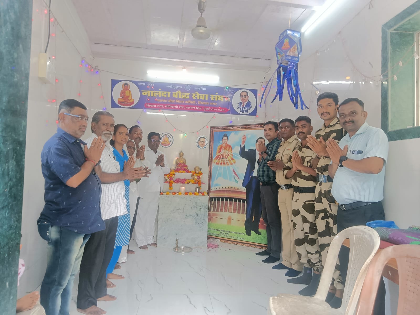 मुंबई : तथागत भगवान गौतम बुद्ध जयंती २५६८वी नांलदा बौध्द सेवा संघ रजि.यांच्या वतीने सिमलानगर मलबार हिल येथे नांलदा बौध्द सेवा संघाचे संस्थापक अध्यक्ष बौद्धाचार्य समाजभूषण-सो ना कांबळे गुरूजी यांच्या अध्यक्षतेखालील मोठया उत्साहात संपन्न झाली प्रथमतः तथागत भगवान गौतम बुद्ध व महामानव क्रांतिसूर्य बौद्धीसत्व प पूज्य विश्वरत्न डाॅ बाबासाहेब आंबेडकर यांच्या भव्य प्रतिमेला पुष्प अर्पण,मेनबती व आगरबती प्रज्वलित उपस्थितीत मान्यवरांच्या शुभहस्ते करून बुद्धवंदना पूजापाठ करून तथागत भगवान गौतम बुद्ध व डाॅ बाबासाहेब आंबेडकर यांना मानवंदना देवून विनम्र अभिवादन करण्यात आले. सदर बुद्ध जयंती कार्यक्रम आयोजन नालंदा बौद्ध सेवा संघाचे सरचिटणीस बी जी गायकवाड गुरूजी यांनी करून सूत्रसंचालन केले. सदर प्रसंगी समाजभूषण बौद्धाचार्य सो ना कांबळे गुरूजी यांनी तथागत भगवान गौतम बुद्धाची महती सांगताना म्हणाले की,बुद्धांच्या आयुष्यातील जन्म,संबोधीप्राप्ती (दिव्यज्ञान)आणि महापरिनिर्वाण या महत्वपूर्ण तीन घटना वैशाख पौर्णिमेस घडल्या असल्याने जगभरातील बौध्दांसाठी संपूर्ण वैशाख महिना बुद्ध जयंती किंवा वेशाक या नावाच्या महोत्सवाचे एक महापर्वच मानले जाते. जगातील लोकांनी बुद्ध तत्वज्ञान घेऊन गगनभरारीतून विकास झाला आहे, “जगाने बुद्ध स्विकारला म्हणून जगप्रगतीपथावर गेले आहे.त्यात भारत मागे असून डाॅ बाबासाहेब आंबेडकर यांनी सांगितल्या मार्गानुसार बुद्ध धम्म भारताने स्विकारला तर भारत बौध्दमय होईल उद्याचे दिवस सोन्याचे भारतात उगवतील” असे कांबळे यांनी ठणकावून सांगुन ते पुढे म्हणाले की,भगवान गौतम बुद्ध मुक्तीदाते नसून मार्गदाते आहेत जगातला युध्द नको बुद्ध हवा! शांती संदेश हवा हिच खरी दवा व दुवा असल्याचे आवर्जून आपल्या प्रदीर्घ प्रवचनात सांगून “जग मै है बुद्ध नाम! यह है भारत शान है!” बुद्धाचे विचार जगाला कळले, बाबासाहेब आंबेडकरांमुळे आमचे मन बुद्धाकडे वळले म्हणूनच आज आम्हाला दिवस चांगले आले आहेत बुद्धाच्या विचाराने जगाचा उध्दार झाला त्याच प्रमाणे बरोबर आपलाही उध्दार बाबासाहेब आंबेडकर यांच्या सविधान व बौद्ध धम्मातून झाल्याचे सो ना कांबळे यांनी आवर्जुन सांगून बुद्ध जयंती निमित्त उपस्थितीतांना शुभेच्छा दिल्या सदर प्रसंगी मलबार हिल पोलीस ठाण्याचे सिनियर सन्मानीय श्री उदयसिंग शिंगाडे यांच्या मार्गदर्शनाखाली मीलस्पेशल श्री सचिन वाघमारे,श्री प्रविण चौगुले,श्री मधुकर नामदेव बागुल पोलीस हवालदार बीट न॔बर तीन सिमलानगर चौकी,महाराष्ट्र सुरक्षा बळ,श्री उमेश तोंडे,निलेश महाले आदि पोलीस स्टाॅप वर्गा बरोबर बुद्ध जयंती उत्सव सोहळा यशस्वी करण्याकरीता सर्वश्
