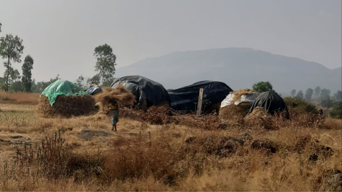 मोखाडा : पालघर जिल्ह्यातील अतिदुर्गम मोखाडा तालुक्यात आजही पारंपारिक पद्धतीने शेती केली जाते. ही सर्व शेती कामधेनूवरच अवलंबून असून त्यांच्याच माध्यमातून केली जाते. त्यामुळे शेतकरी कामधेनूला आपल्या लेकराप्रमाणे जीव लावतात. टंचाई काळात त्यांना चारा मिळावा म्हणून भाताच्या पेंढ्यांचे ऊडवे रचून ठेवलेले असतात. मात्र, मागील आठवड्यात सलग सहा दिवस झालेल्या अवकाळी पाऊस आणि गारपीठीने, पेंढ्यांचे ऊडवे भिजले आहेत. आता त्याला बुरशी येऊन तो काळा पडू लागला आहे. त्यामुळे मोखाड्यात गोधनाच्या चाऱ्याचा प्रश्न ऐरणीवर आला आहे. जनावरांना चारा मिळावा शेतकरी धडपड करत आहेत.