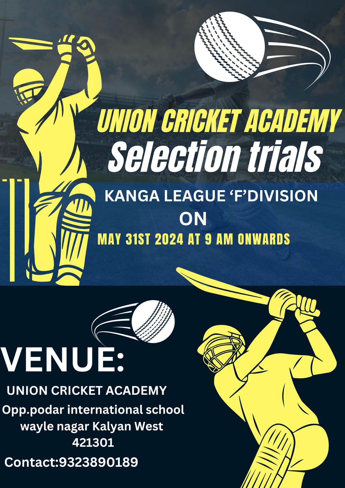 निवड प्रक्रिया शुक्रवार, 31 मे रोजी सकाळी 9 वाजता सुरू होईल. निवड प्रक्रिया युनियन क्रिकेट अकादमी, पोद्दार इंटरनॅशनल स्कूल समोर, वाली नगर, कल्याण पश्चिम येथे होणार आहे. कांगा लीग ‘एफ’ क्रिकेट संघ निवडीसाठी वयाचे कोणतेही बंधन नाही. तरी या निवड चाचणीसाठी इच्छुक खेळाडूंनी मोठ्या संख्येने उपस्थित राहावे, असे आवाहन युनियन क्रिकेट अकादमीचे तुषार सोमाणी यांनी केले आहे. अधिक माहितीसाठी ९३२३८९०१८९ या मोबाईल क्रमांकावर संपर्क साधावा.