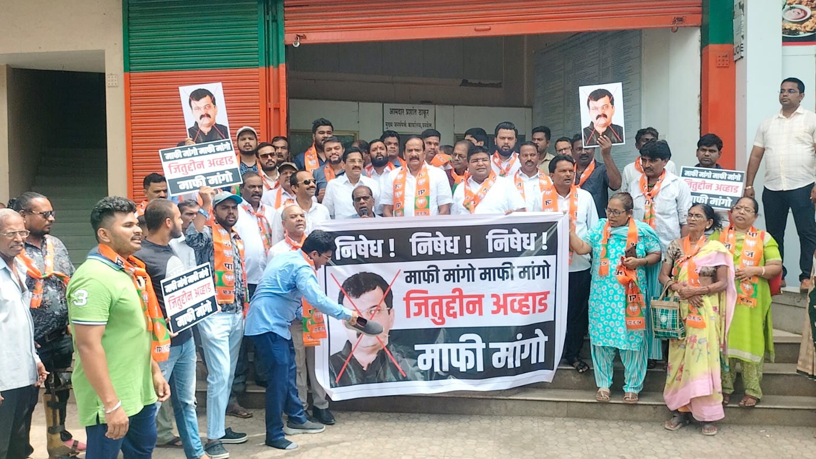 पनवेल : महाडच्या आंदोलनात राष्ट्रवादी काँग्रेस शरद पवार गटाचे आमदार जितेंद्र आव्हाडांनी भारतरत्न डॉ. बाबासाहेब आंबेडकर यांचा अवमान केल्यामुळे भारतीय जनता पार्टीच्या वतीने आज आव्हाडांविरोधात पनवेलमध्ये जोरदार आंदोलन करण्यात आले. यावेळी आव्हाड यांच्या प्रतिमेला जोडे मारत जोरदार निषेध व्यक्त करण्यात आला.