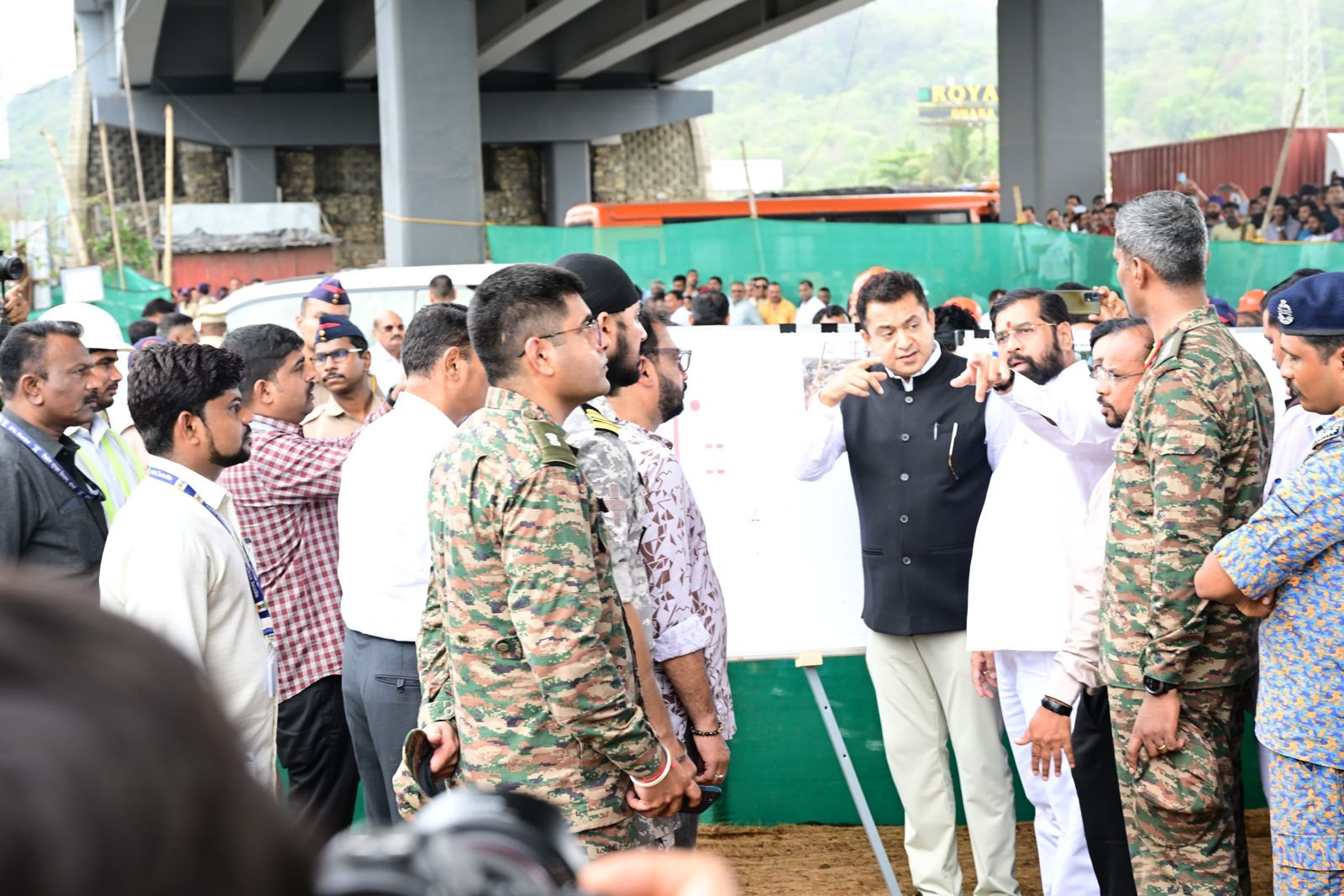 यावेळी घटनास्थळी पालघरचे जिल्हाधिकारी गोविंद बोडके, मुंबई महानगर प्रदेश विकास प्राधिकरण(एम.एम.आर.डी.ए.) चे महानगर आयुक्त डॉ. संजय मुखर्जी, वसई विरार महानगरपालिकेचे आयुक्त अनिल पवार, मिरा भाईंदरचे पोलिस आयुक्त मधुकर पांडे, मिरा भाईंदरचे अतिरिक्त पोलिस आयुक्त श्रीकांत पाठक, जिल्हा प्रशासनातील वरिष्ठ अधिकारी, तसेच स्थानिक लोकप्रतिनिधी उपस्थित होते. सूर्याप्रकल्पाचे पाणी मीरा भाईंदरच्या दिशेने नेण्यासाठी एम.एम.आर.डी.ए. मार्फत राबविण्यात येणाऱ्या प्रकल्पाच्या वर्सोवा पुलाखालील बांधकामाच्या ठिकाणी झालेल्या दुर्घटनेत जेसिबी ऑपरेटर राकेश यादव हे जेसीबीसह ढीगाऱ्याखाली आडकले असून, त्यांना बाहेर काढण्याचे काम युद्धपातळीवर सुरू आहे. घटनास्थळी भारतीय नौसेना (Navy), भारतीय लष्कर (Army), राष्ट्रिय आपत्ती प्रतिसाद दल – NDRF, ठाणे आपत्ती प्रतिसाद दल- TDRF, अग्निशमन दलाच्या तुकड्यांना बोलवण्यात आले आहे. दुर्घटनाग्रस्त व्यक्तीला बाहेर काढण्यासाठी व्हीजेटीआयच्या तज्ञ प्राध्यापकांचे मार्गदर्शनही घेण्यात येत आहे. घटनास्थळाची पाहणी करताना मुख्यमंत्री एकनाथ शिंदे म्हणाले , भारतीय नौदल व भारतीय लष्करातील जवानांना बाचाव कार्याचा अनुभव असतो त्यामुळे त्यांच्या अनुभवाचा उपयोग करून या दुर्घटनेतील व्यक्तीला बाहेर काढण्यास यश मिळेल. दुर्घटनाग्रस्त व्यक्तीचा दुर्दैवाने मृत्यू झाला असल्यास त्या व्यक्तीच्या कुटुंबीयांना एल. अँड टी. कंपनी मार्फत पन्नास लाख रुपयांची मदत आणि त्या व्यक्तीच्या कुटुंबातील एका सदस्याला एल अँड टी. कंपनीत नोकरी मिळणार असल्याचेही यावेळी मुख्यमंत्री एकनाथ शिंदे यांनी सांगीतले. यावेळी राकेश यादव यांच्या पत्नी, दोन मुली, एक मुलगा आणि वडील व इतर सदस्यांची भेट घेतल्यानंतर मुख्यमंत्री शिंदे यांनी त्यांच्या निवासाची व्यवस्था करण्याच्या सूचना जिल्हधिकारी बोडके यांना दिल्या.