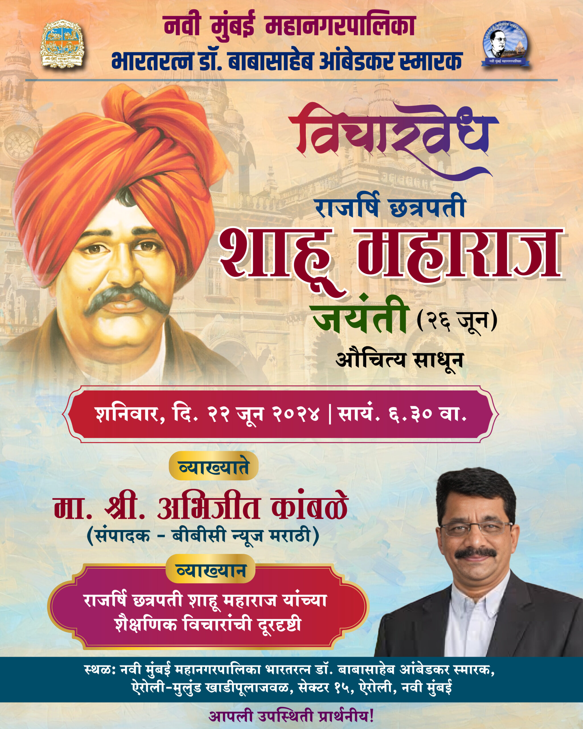 नवी मुंबई : महाराष्ट्राच्या सामाजिक, सांस्कृतिक, शैक्षणिक अशा सर्वच क्षेत्रातील विकासात महत्वपूर्ण योगदान असणा-या राजर्षि छत्रपती शाहू महाराज यांच्या जयंतीचे औचित्य साधून नवी मुंबई महानगरपालिकेच्या वतीने ऐरोली येथील भारतरत्न डॉ. बाबासाहेब आंबेडकर स्मारकात छत्रपती शाहू महाराजांच्या प्रेरणादायी कार्याला उजाळा देण्यासाठी विशेष व्याख्यानाचे आयोजन करण्यात आलेले आहे.