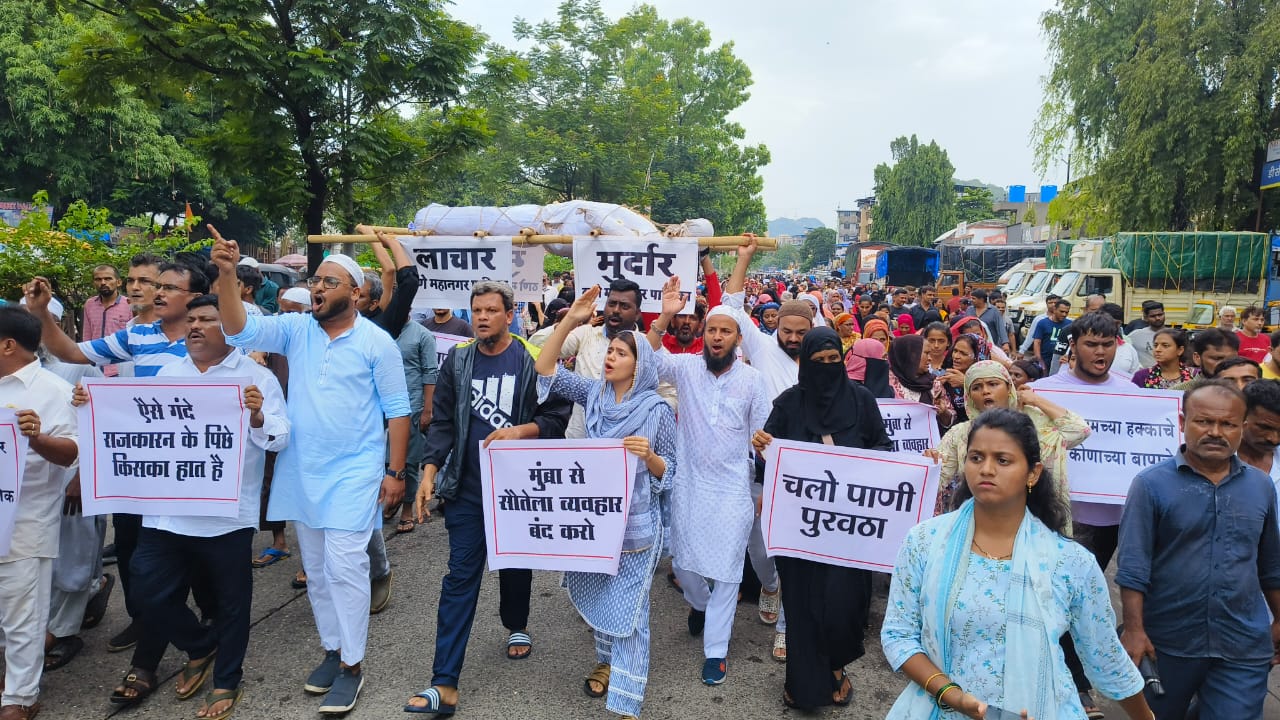 ठाणे : विविध कारणे पुढे करून सातत्याने मुंब्रा- कौसावासियांना पाण्यापासून वंचित ठेवले जात आहे. या सापत्न वागणुकीच्या निषेधार्थ सामाजिक कार्यकर्त्या मर्जिया शानू पठाण यांच्या नेतृत्वाखाली भरपावसात मुंब्रावासिय रस्त्यावर उतरले. दारूल फलाह मस्जिदपासून फायर ब्रिगेड येथील पाणीपुरवठा कार्यालयावर तिरडी मोर्चा नेऊन नियमित पाणीपुरवठा करावा, अशी मागणी केली. तसेच, कार्यालयाचे दार उघडत नसल्याने प्रवेशद्वारासमोर मडकी फोडत ठिय्या धरला. यावेळी माजी विरोधीपक्ष नेते अश्रफ (शानू) पठाण हे देखील उपस्थित होते. दरम्यान, येत्या मंगळवार पर्यंत पाणीपुरवठा सुरळीत न केल्यास बुधवारी ठामपावर धडक मोर्चा नेण्याचा इशारा मर्जिया पठाण यांनी दिला.