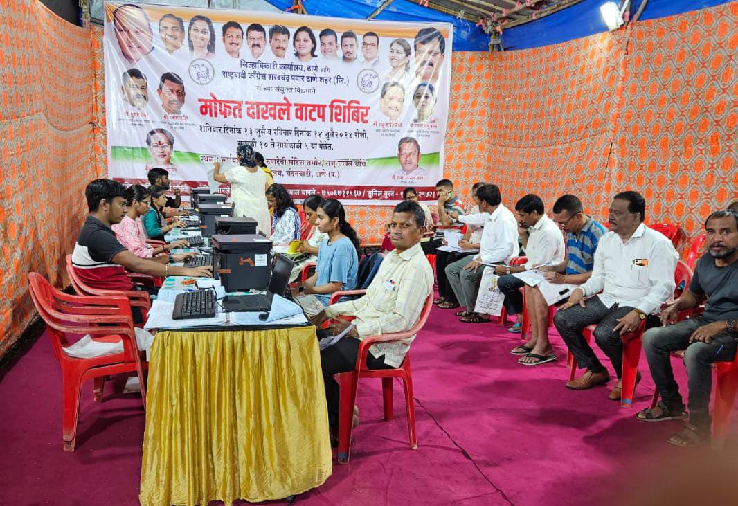 ठाणे ः ठाण्यातील चंदनवाडीतील रुपादेवी मंदिरासमोर जिल्हाधिकारी कार्यालय ठाणे आणि राष्ट्रवादी काँग्रेस पक्ष शरदचंद्र पवार ठाणे (शहर) जिल्हा यांच्या संयुक्त विद्यमाने तसेच असंघटित कामगार सेलचे ठाणे जिल्हा अध्यक्ष राजु चापले, रुपाली चापले आणि राजेश जगन्नाथ साटम यांच्या मार्गदर्शनाखाली शनिवार आणि रविवारी मोफत दाखले वाटप शिबिराचे आयोजन करण्यात आले होते. शिबिरास विभागातील नागरिकांनी उस्फुर्त प्रतिसाद लाभला.