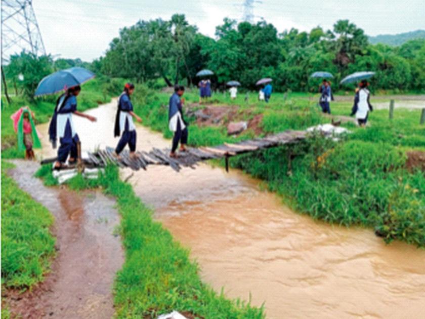 येथील शाळकरी विद्यार्थ्यांना शाळेत जाताना नदी ओलांडून जीव मुठीत घेऊन जावे लागते. मात्र, पावसाळ्यात या नदीला नेहमीच पूर येतो, त्यामुळे गावकऱ्यांनी तात्पुरत्या स्वरूपात तेथे लाकडी पूल तयार केला आहे, मात्र हा पूल कमकुवत असून, येथे दुर्घटना घडण्याची भीती व्यक्त होत आहे. दरम्यान गावकऱ्यांनाही शहरात येण्यासाठी हाच मार्ग असल्याने त्यांनाही तारेवरची कसरत करावी लागत आहे. एकीकडे जिल्ह्यातील विकासकामांसाठी काेटींच्या निधीची तरतूद करण्यात येते, मात्र तो निधी कुठे वापरला जातो, असा सवाल येथील नागरिक करत आहेत.