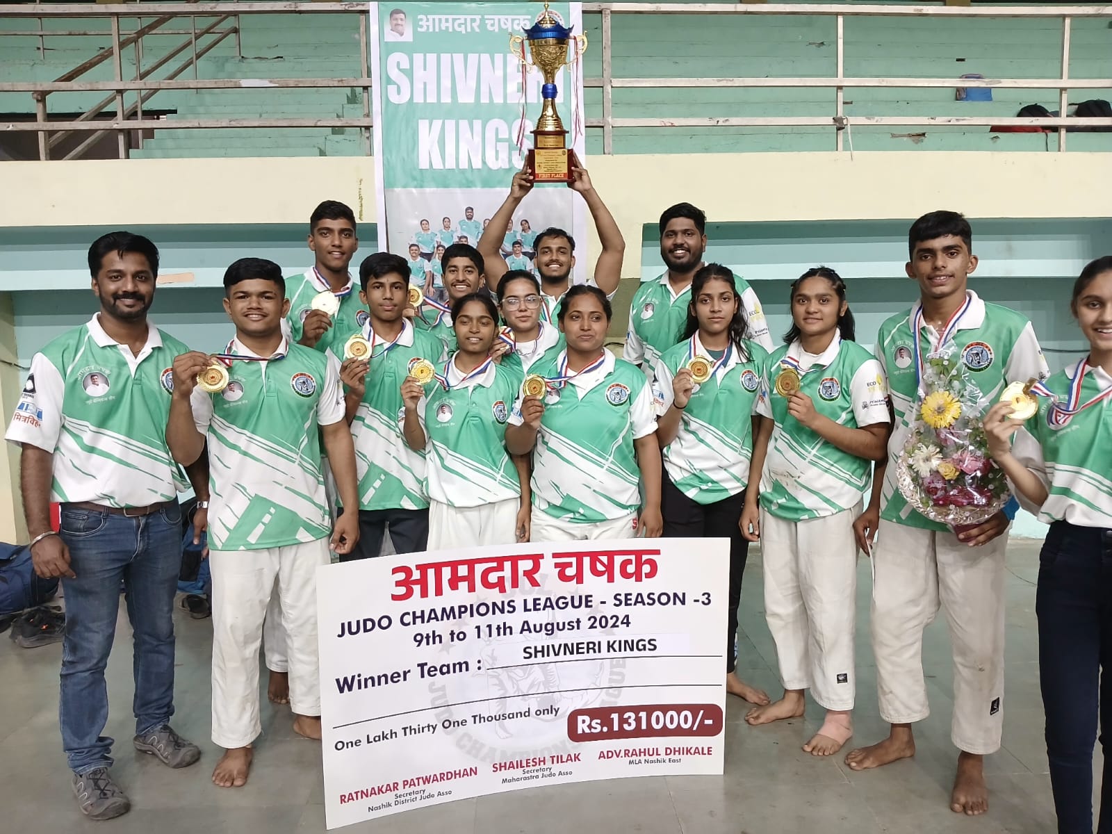 मुंबई : नाशिक जिल्हा जुडो असोसिएशनच्या वतीने आमदार राहुल जी डिकले मित्र विहार क्लब आणि यशवंत व्यायाम शाळा यांच्या सहकार्याने मीनाताई ठाकरे विभागीय क्रीडा संकुल, हिरावाडी, पंचवटी येथे तिसऱ्या जुडो चॅम्पियन लीग स्पर्धेत शिवनेरी किंग संघाने जेते पदाचा मान मिळवला. कॅडेट, ज्युनिअर, सिनिअर पुरुष व महिला खेळाडूंचा समावेश असलेल्या या लीगमध्ये एकूण आठ संघ होते. प्रत्येक टीम मध्ये १२ खेळाडू “ऑल प्ले ऑल” होते त्यामध्ये २९० गुण मिळवून शिवनेरी किंग अव्वल स्थानावर होते त्यानंतर तोरणा टायगर २५० गुण, अंकाइ अट्टेकर २३० गुण, देवगिरी २०० गुण त्यामध्ये उपांत्य फेरीत शिवनेरी व अंकाइ विजयी होऊन शिवनेरी व अंकाइ अंतिम फेरीत दाखल झाले. त्यामध्ये अटीतटीच्या निर्णायक सामन्यामध्ये शिवनेरी किंगने ५-० अशी बाजी मारली. “बेस्ट जुडोका” म्हणून ओम पाटीलची निवड झाली. बालाजी ए. एस, आयुष फाळके, दर्शन गवले, सनी रानमाळ, शुभांगी राऊत, वैष्णवी पाटील, भारती सेनी, प्रणाली निंबारते, भूमी परदेशी, गंधाली या सर्व खेळाडूंनी जबरदस्त खेळ करून शिवनेरी किंगसाठी विजयश्री खेचून आणली. आदर्श शेट्टी, निखिल सुवर्णा हे विजेत्या संघाचे मालक होते. शेट्टी, सुवर्णा या दोघांचे खेळाडूंना मोलाचे मार्गदर्शन मिळाले.