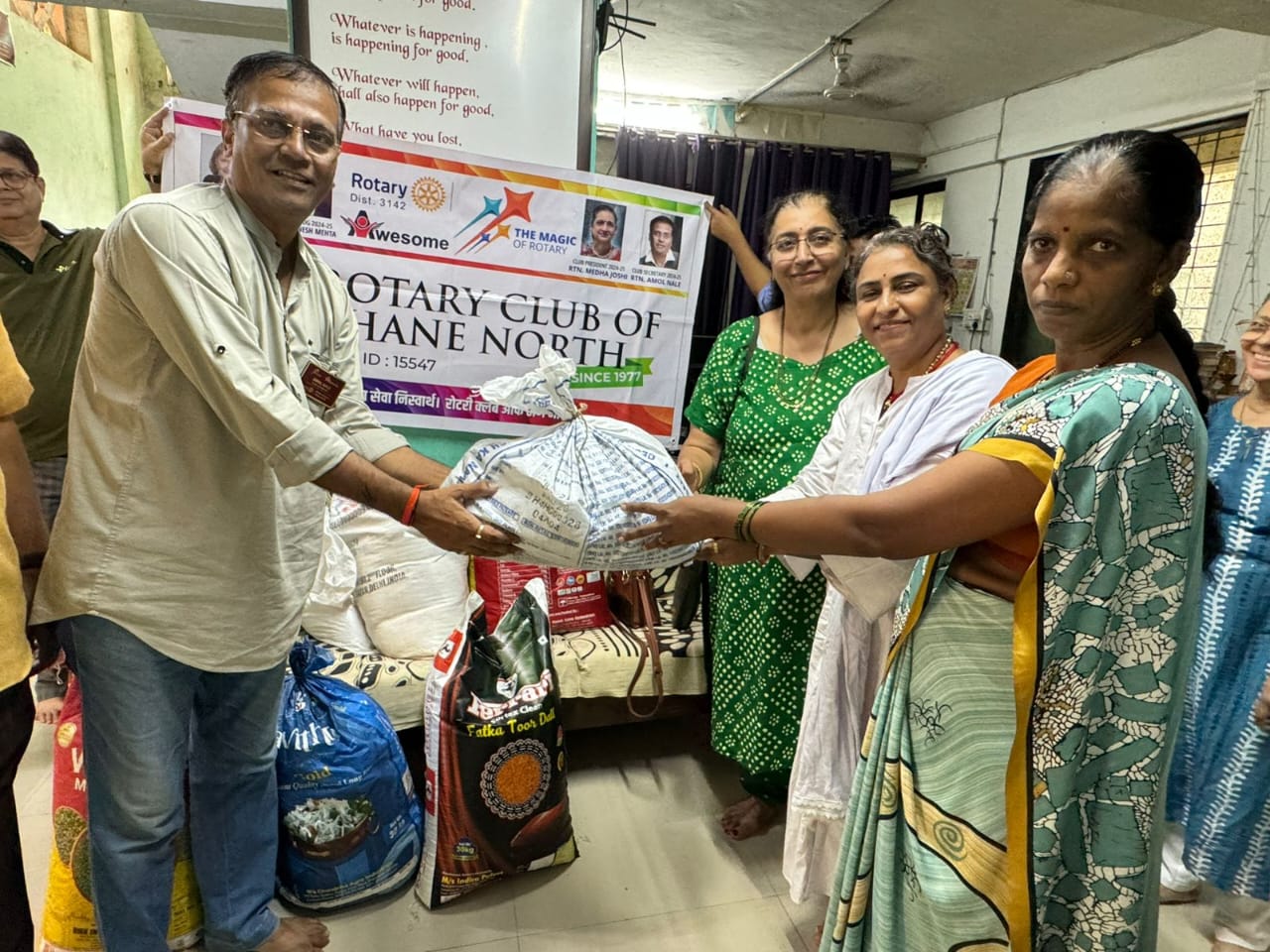ठाणे : ‘जे का रंजले, गांजले त्यासी म्हणे आपुले’ …या उक्तीनुसार बेघर तसेच सोडून दिलेल्या वयोवृद्धांचा संभाळ करणाऱ्या काल्हेर येथील ‘स्मित ओल्ड एज अँड होम केअर फॉउंडेशन’ला रोटरी क्लब ऑफ ठाणे नॉर्थने मोफत अन्नधान्य वाटप केले. स्वातंत्रदिनाचे औचित्य साधुन रोटरी क्लबने आपल्या अन्नदान प्रकल्प अंतर्गत हा उपक्रम नुकताच राबवला.