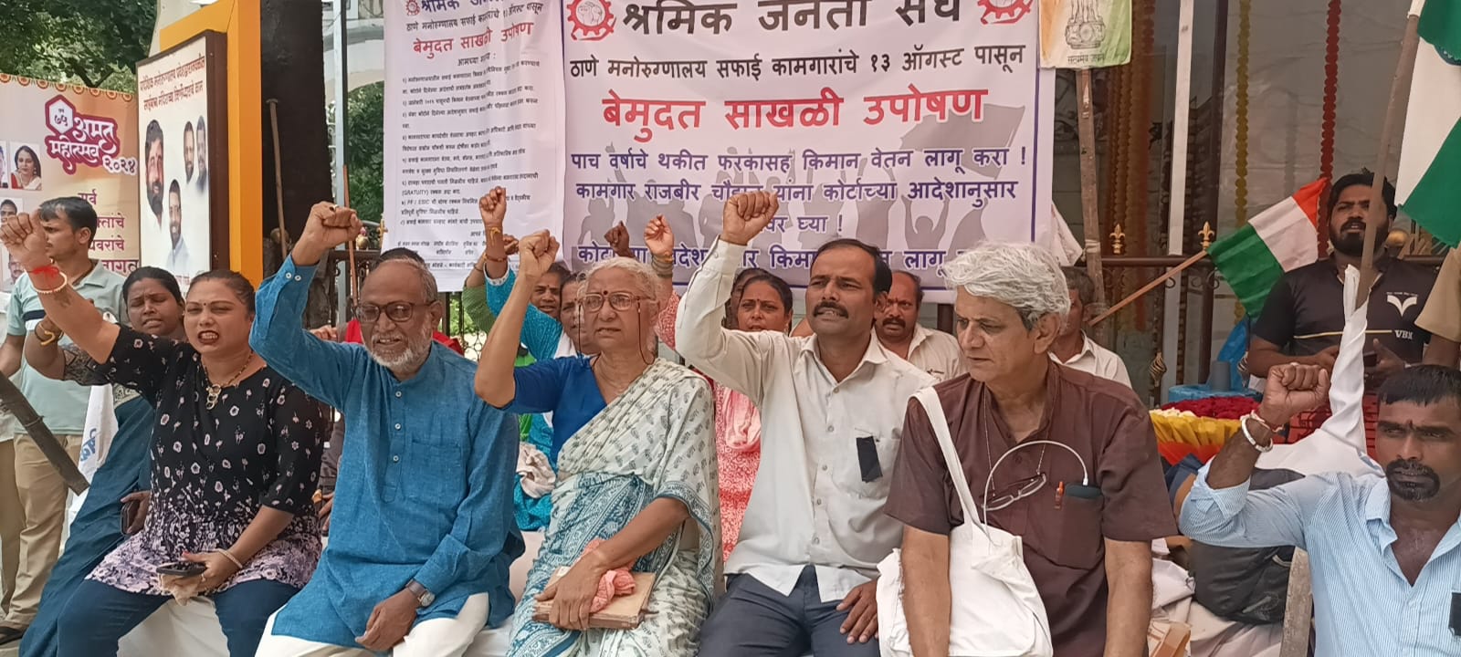 ठाणे :सफाई कामगार हे शहराची साफसफाई करून नागरिकांच्या आरोग्याची काळजी घेतात; मनोरुग्णालयातील सफाई कामगार तर रुग्णालयाच्या साफसफाई बरोबर मनोरूग्णांच्या सफाईचीही जबाबदारी उचलतात. त्यांच्या कामाचं महत्व जाणून त्यांना खरं तर कंत्राटी पद्धतीने कामावर न ठेवता कायम स्वरूपी नोकरीत सामावून घ्यायला हवं पण या कामगारांना न्यायालयाने आदेश देऊनही किमान वेतन दिले जात नाही की मागील वेतनाची थकबाकी अजून दिली जात नाही, असे जेष्ठ सामाजिक कार्यकर्त्या मेधाताई पाटकर म्हणाल्या. ठाण्यातील शासकीय मनोरुग्णालयातील सफाई कामगार किमान वेतन मिळावं आणि वेतन थकबाकी मिळावी म्हणून १३ ऑगस्टपासून साखळी उपोषण करत आहेत. त्यांचे मनोबल वाढवून त्यांना पाठिंबा देण्यासाठी मेधाताईंनी आंदोलन स्थळी भेट दिले. त्यावेळी त्या बोलत होत्या. त्या पुढे म्हणाल्या, कंत्राटदाराने कामगारांना वेळाच्या वेळी वेतन, भत्ते दिले नाहीत तर प्रशासकीय अधिकाऱ्यांनी ते कामगारांना देऊन कंत्राटदारांकडून वसूल केले पाहिजेत असा कायदा असताना इथे अधिकारी ते न करता कंत्राटदारावर सर्व सोपवतात. या कामगारांना अजून जुलै महिन्याचे वेतन दिलेले नाही. लवकरच कामगारांना न्याय नाही मिळाला तर साखळी उपोषणाचे रुपांतर बेमुदत उपोषणात होईल, असा इशाराही त्यांनी मनोरुग्णालयाच्या प्रशासनाला या वेळी दिला. यावेळी मेधाताईंनी महिलांना राखी बांधून या बंधनात आपण एकत्रितपणे राहून आपल्या हक्कांसाठी लढले पाहिजे असे सांगून त्यांना धीर दिला.