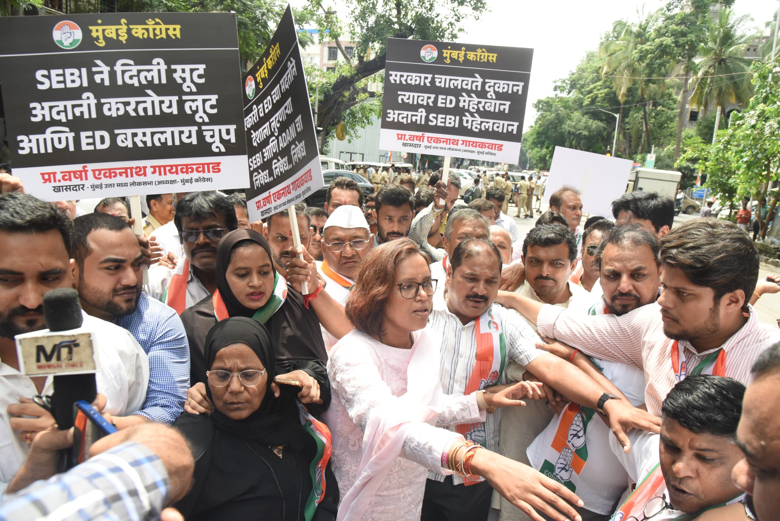 अदानी महाघोटाळ्याची चौकशी ईडीने करावी या मागणी साठी खासदार प्रा. वर्षा गायकवाड यांच्या नेतृत्वाखाली मुंबई काँग्रेसने ईडी ऑफीसवर हजारोंचा मोर्चा काढला. हा मोर्चा अडवण्याचा प्रयत्न पोलिसांनी केला पण कार्यकर्ते हटले नाहीत, त्यांनी रस्त्यावरच ठाण मांडले. यावेळी प्रसार माध्यमांशी बोलताना प्रा. वर्षा गायकवाड म्हणाल्या की, हिंडनबर्गने अदानी कंपनीतील घोटाळा पुराव्यासह उघड केल्यानंतर या घोटाळ्याची चौकशी करण्याची जबाबदारी सेबीकडे देण्यात आली होती पण सेबीच्या प्रमुख माधवी बुच याच या घोटाळ्याच्या लाभार्थी असल्याचे समोर आले आहे मग चोरी करणारा चौकशी कसा करेल. शेअर बाजारात सर्वसामान्य व मध्यम वर्गातील लोकांनी आपल्या कष्टाचा पैसा गुंतवलेला आहे, तोही सुरक्षित राहिलेला नाही. विरोधी पक्षांच्या नेत्यांवर धडक कारवाई करणारी ईडी अदानी कंपनीचा महाघोटाळा उघड झाला तरी त्यांची चौकशी का करत नाही? असा प्रश्न त्यांनी विचारला.