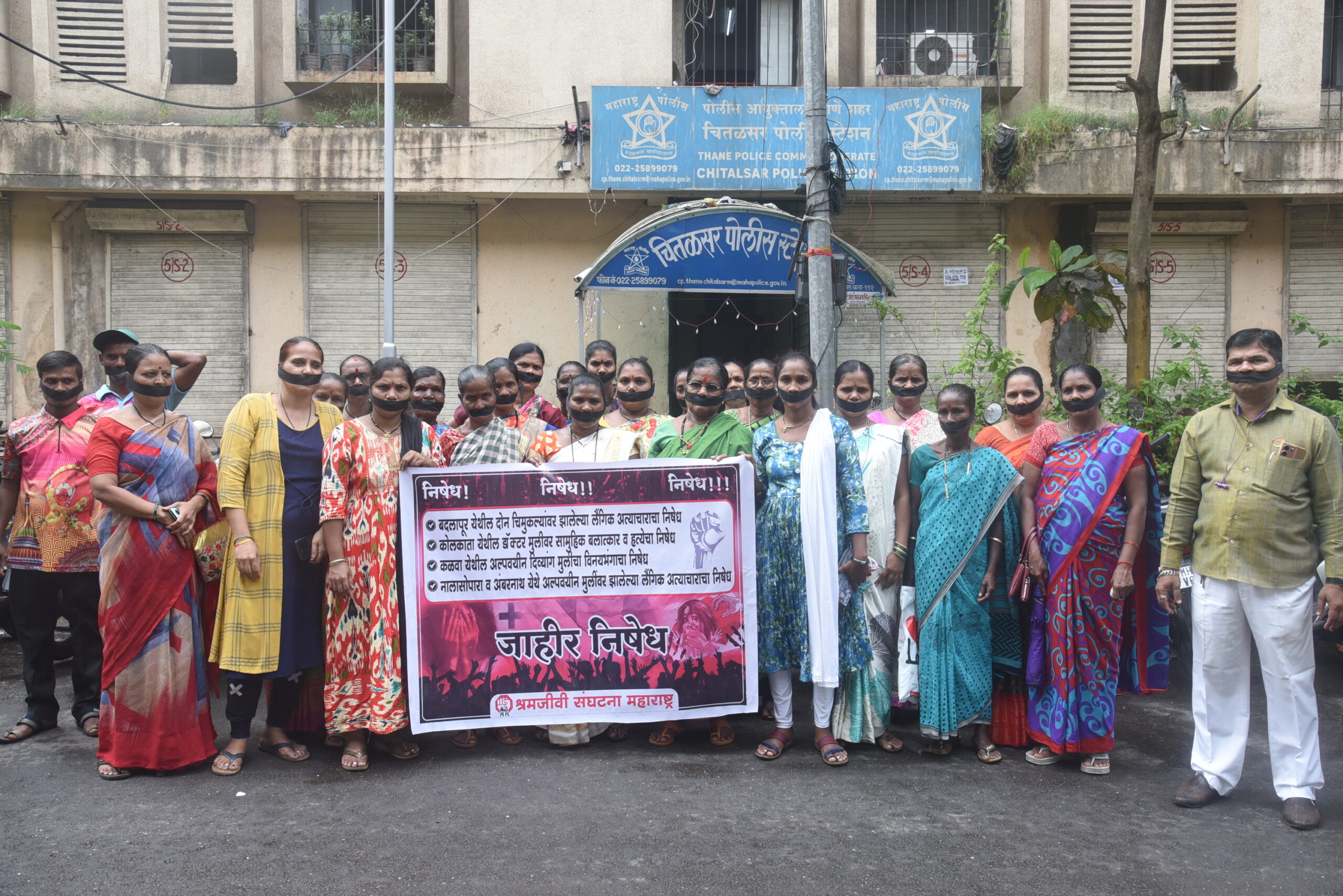 ठाणे : महिला व मुलींवर लैंगिक अत्याचार करणाऱ्या नराधमाविरोधी फास्ट ट्रॅक कोर्टमध्ये निर्णय घेवून त्यांना फाशीची शिक्षा देण्यात यावी या मागणीसाठी श्रमजीवी संघटनेचे संस्थापक विवेक पंडित यांच्या मार्गशनाखाली माजिवडा-मानपाडा प्रभाग समिती शेतकरी घटक संतोष गावित यांच्या नेतृत्वाखाली श्रमजीवी संघटनेच्या वतीने ठाण्यातील चितळसर मानपाडा पोलीस स्टेशनच्या बाहेर तोंडाला काळ्या पट्ट्या बांधून मूक निदर्शने करण्यात आली व पोलिसांना निवेदन देण्यात आले.