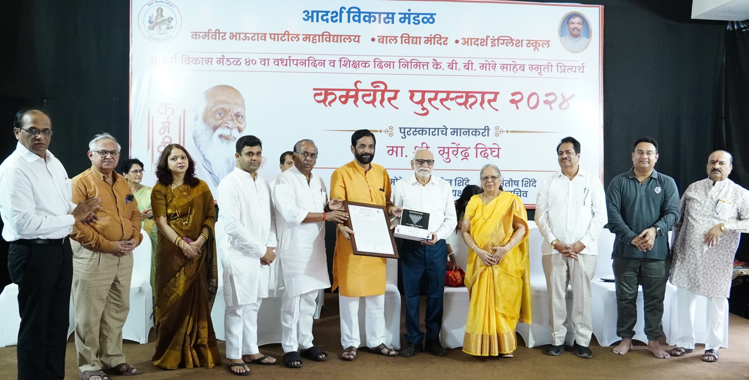 ठाणे : आदर्श विकास मंडळाचा 40 वा वर्धापन दिन सोहळा 1 सप्टेंबरला संपन्न झाला. संस्थापक अध्यक्ष बी. बी. मोरे यांच्या स्मृतिप्रित्यर्थ संस्थेचा वर्धापनदिन व शिक्षकदिनाचे औचित्य साधून शिक्षण क्षेत्रात बहुमोल योगदान देणाऱ्या व्यक्तीचा कर्मवीर पुरस्कार देऊन सन्मान करण्यात येतो. या वर्षीचा हा चौथा कर्मवीर पुरस्कार ठाण्यातील प्रतिथयश अशा सरस्वती शाळेचे संचालक सुरेंद्र दिघे यांना आमदार संजय केळकर, खासदार नरेश म्हस्के, ज्येष्ठ नगरसेवक हणमंत जगदाळे यांच्या प्रमुख उपस्थितीत प्रदान करण्यात आला.