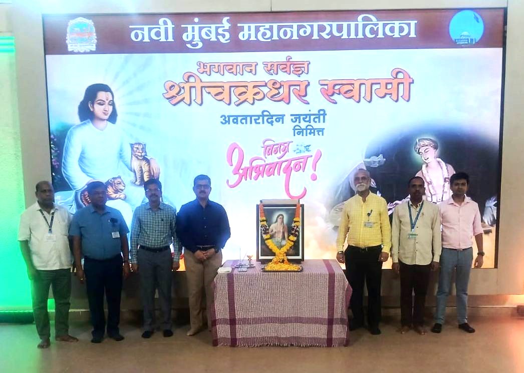 शांती, समता व अहिंसा यांची शिकवण देणारे महानुभाव पंथाचे आद्य प्रवर्तक भगवान सर्वज्ञ श्री चक्रधर स्वामी अवतारदिन जयंतीनिमित्त नवी मुंबई महानगरपालिका मुख्यालयात अतिरिक्त आयुक्त सुनिल पवार यांच्या हस्ते प्रतिमापूजन करुन अभिवादन करण्यात आले. याप्रसंगी समाजविकास विभागाचे उपआयुक्त किसनराव पलांडे, प्रशासकीय अधिकारी उत्तम खरात व विलास मलुष्टे आणि इतर अधिकारी व कर्मचारी उपस्थित होते.