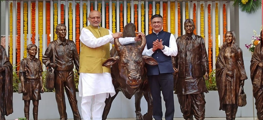 मुंबई : राज्यपाल सी.पी. राधाकृष्णन यांनी बांद्रा कुर्ला कॉम्प्लेक्स येथील नॅशनल स्टॉक एक्सचेंजच्या मुख्यालयासमोर वृषभ (बुल) व सामान्य लोक दर्शवणारया शिल्पकृतीचे अनावरण केले.