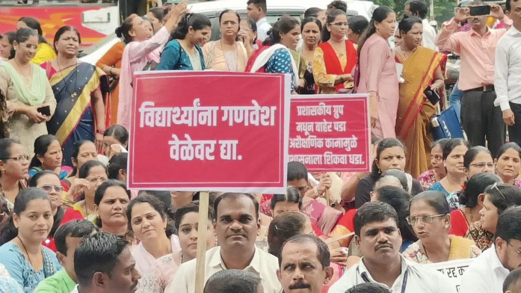 राज्य शासनाची प्राथमिक शिक्षण क्षेत्रातील धोरणे चुकीची असल्याचा आरोप करत राज्यातील सर्व शिक्षक संघटनांनी शासनाविरोधात असहकाराची हाक दिली होती. यानुसार ठाणे जिल्हा परिषद शाळेतील शिक्षकांनी २५ सप्टेंबरला सामूहिक रजा घेऊन जिल्हाधिकारी कार्यालयावर मोर्चा काढण्याचा निर्णय घेतला होता. परंतु पोलिसांनी मोर्चाला परवानगी नाकारल्यामुळे शिक्षकांनी सामुहिक रजा घेऊन ठाणे जिल्हाधिकारी कार्यालयासमोर निदर्शने केली. शिक्षकांच्या या आंदोलनामुळे जिल्हा परिषद शाळा बंद होत्या. आधारवर आधारित संच मान्यता, वीस पटाला एक कायम आणि एक कंत्राटी शिक्षक हे शासनाचे धोरण विद्यार्थी विरोधी असल्याचा आरोप करत त्यास शिक्षक संघटनांसह पालकांनी विरोध केला आहे. या आंदोलनाच्या पार्श्वभूमीवर शासनाने या निर्णयामध्ये अंशतः बदल करून वीस ऐवजी दहा पटाला एक कंत्राटी शिक्षक, प्रत्यक्ष वर्गातील विद्यार्थी संख्येवर शिक्षक निश्चिती यासारखे शासन निर्णय निर्गमित केले होते. परंतु शिक्षकांनी आंदोलनावर ठाम राहत जिल्हाधिकारी कार्यालयासमोर जोरदार घोषणाबाजी करत निदर्शने केली. मोफत गणवेश योजना चुकीचे पद्धतीने राबविल्याने गणवेश उशिरा प्राप्त होत आहेत. गणवेश योजना जुन्याच पद्धतीने राबवावी. पाठ्यपुस्तकात कोरी पाने देण्याऐवजी स्वतंत्र वही द्यावी, पोषण आहार योजना स्वतंत्र्य योजनेकडे सोपवावी, याबाबत प्रामुख्याने घोषणाबाजी होत होती.