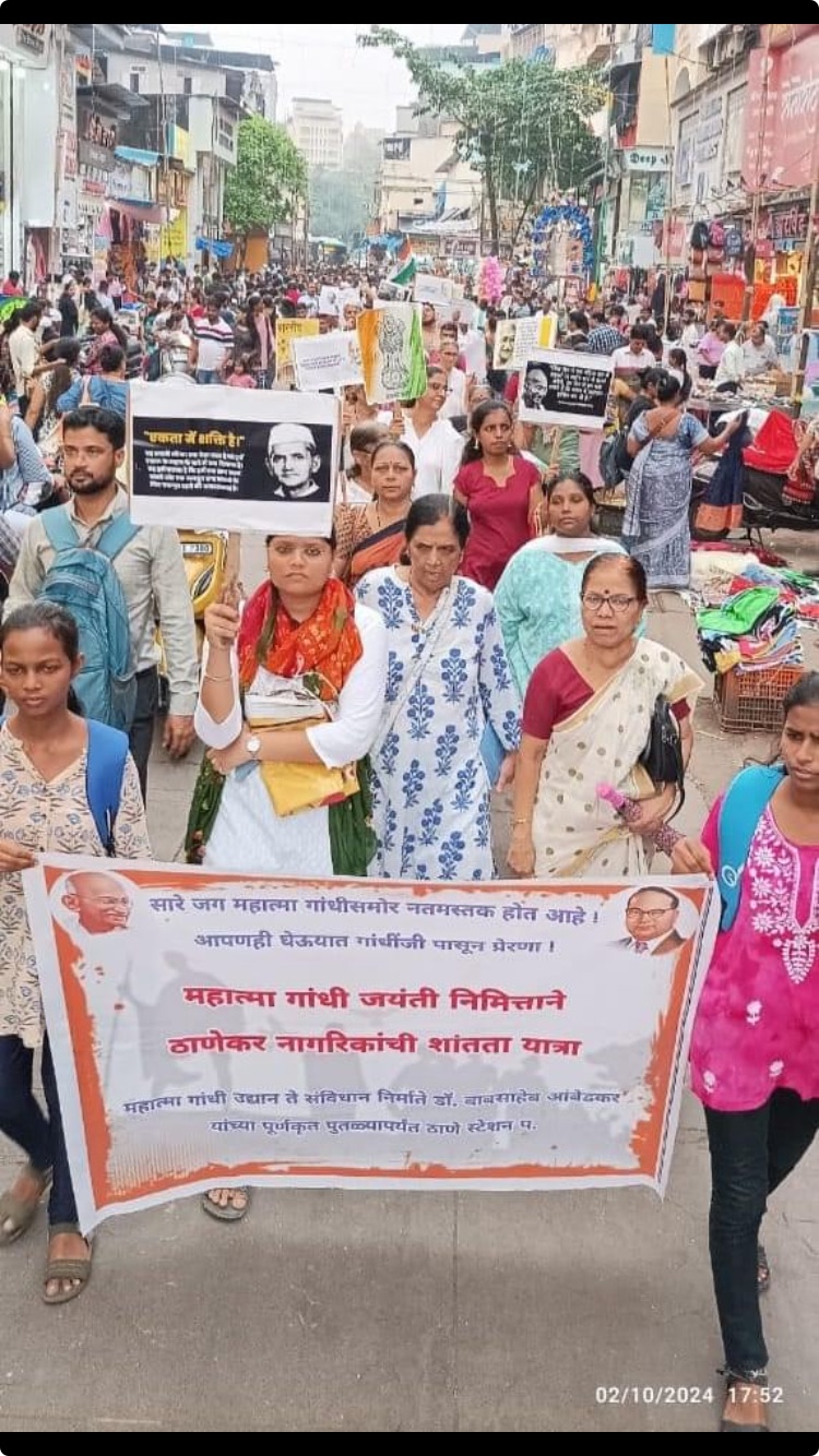 जन आंदोलनाच्या राष्ट्रीय समन्वयाचे समन्वयक संजय मं. गो. यांनी अहिंसक मार्गाने केले जाणारे लडाखच्या सोनम वांगचुक यांच्या आंदोलनात सोनम वांगचुक यांना अटक झाल्याचे सांगून आज सरकारच्या कामावर टीका करणे गुन्हा समजला जात आहे, त्या विरुद्ध लढायला हवे, असे आवाहन केले. गांधी पुतळ्याला अभिवादन केल्यावर सर्व जण मिरवणुकीने तळापाळीला फेरी मारुन बाजाराच्या रस्त्यातून स्टेशन जवळच्या आंबेडकर पुतळ्यापाशी गेले. तिथे सत्य अहिंसा जिंदाबाद, जय जवान जय किसान आशा सारख्या घोषणा दिल्या. भारतीय महिला फेडरेशनच्या उर्मिला पवार यांनी पथनाट्य सादर केले. अंधश्रद्धा निर्मूलन समितीच्या वंदना शिंदे यांनी चळवळीची गाणी म्हटली. व्यसन मुक्ती अभियानाच्या ललित मरोठिया यांनी गांधीजींच्या दारुमुक्तीच्या आग्रहाचे आपण पालन करूया असे आवाहन केले. समता विचार प्रसारक संस्थेच्या अजय भोसले यांनी गांधीच्या विचारांची आजच्या नफरतने भरलेल्या वातावरणात नितांत आवश्यकता आहे असे आग्रहाने सांगितले. भारत जोडो अभियानाचे ओसामा रावलगावकर यांनी सर्व धर्म समभाव आणि समाजात शांती राखण्याचे गांधींजींचे तत्त्व आपण लक्षात ठेवले पाहिजे असे नमूद केले. यावेळी राष्ट्र सेवा दल, साने गुरुजी कथा माला, स्वराज अभियान, श्रमिक जनता संघ, आनंदवाटा प्रतिष्ठान, कोळावाडे गावठाण संवर्धन समिती, वुई नीड यू, राज्य सरकारी कर्मचारी संघटना आदी संघटनांचेही प्रतिनिधीही सहभागी झाले होते.