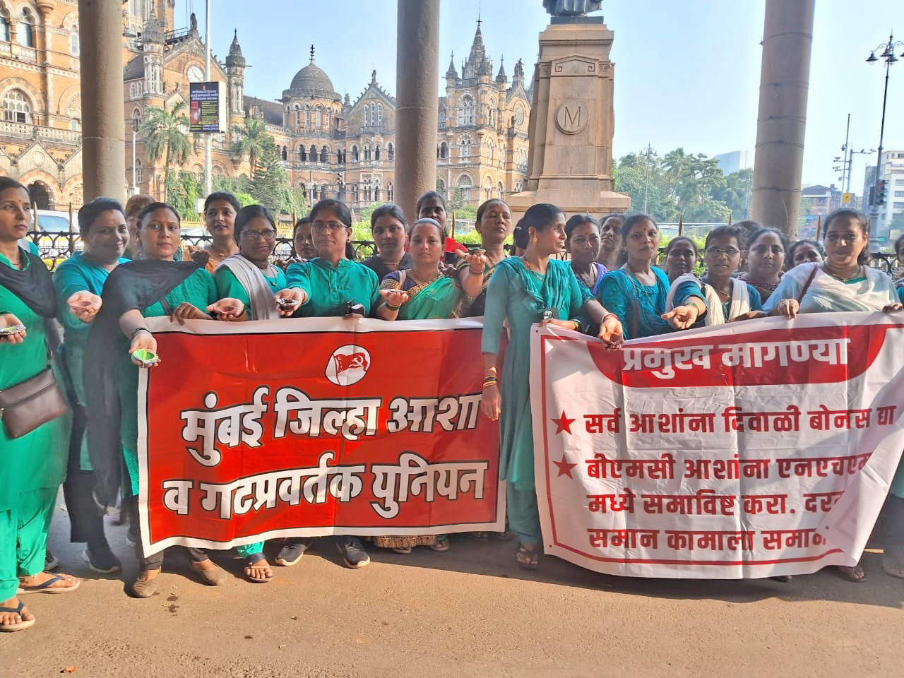 बोनस न मिळाल्याने व वाढत्या महागाईमुळे यंदा आशांची दिवाळी अंधारात जाणार आहे. या वेळी बीएमसीच्या असंवेदनशीलतेचा निषेध व्यक्त करण्यात आला. करोना महामारीत जीवाची बाजी लावून काम करणाऱ्या आशा वर्कर्स बद्दल बीएमसीच्या या भेदभावपूर्ण वागणुकीच्या विरोधात घोषणा देण्यात आल्या. हे आंदोलन आरमायटी इराणी, संगीता कांबळे, आरती कांबळे, मृणाल जंगम, अदिती तटकरे, सारिका इंगळे इत्यादी पदाधिकाऱ्यांच्या नेतृत्वाखाली करण्यात आले.