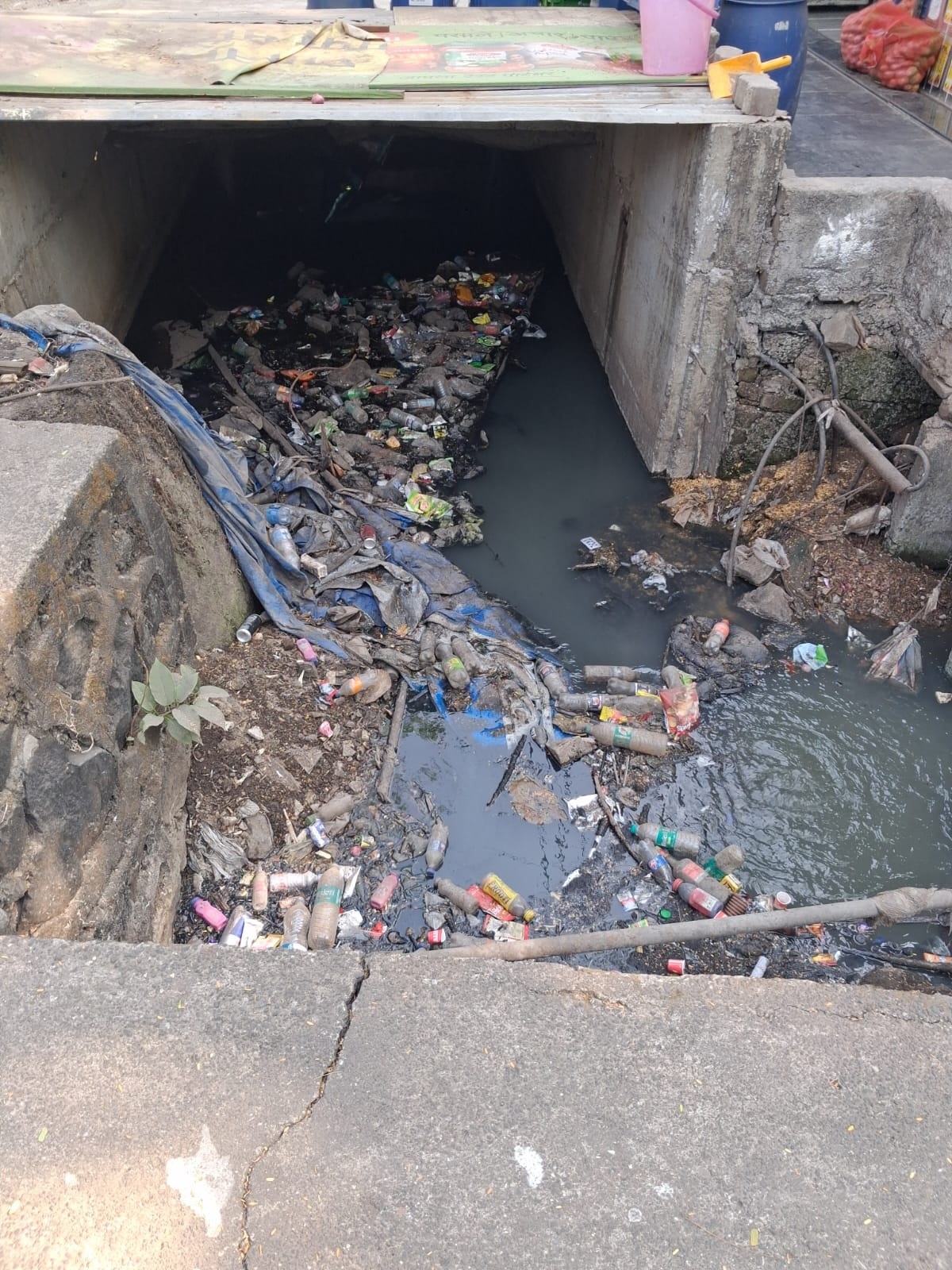 नाला कचरा, प्लास्टिकने भरला त्यात सांडपाणी वाहिनी फुटली