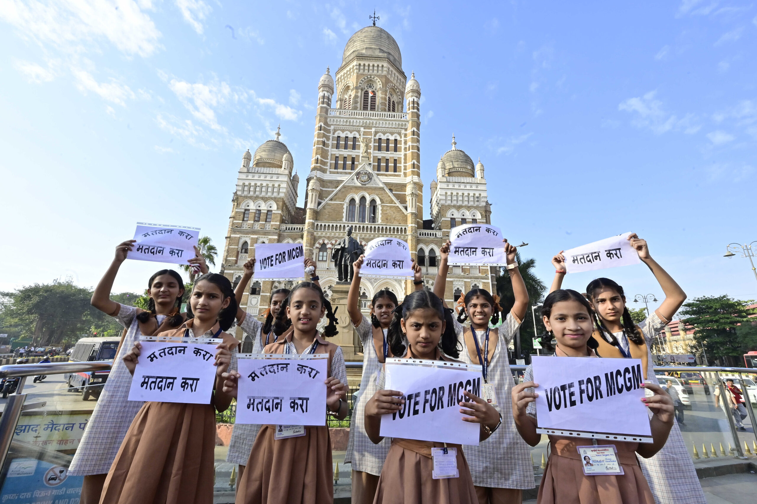 मुंबईतील आगामी महापालिका निवडणुकीच्या पार्श्वभूमीवर लोकशाहीचा उत्सव अधिक व्यापक व्हावा, या उद्देशाने बीएमसी शाळेतील विद्यार्थ्यांनी मतदार जनजागृतीचा अनोखा उपक्रम राबवला. १५ जानेवारी २०२५ रोजी नागरिकांनी आवर्जून मतदानाचा हक्क बजावावा, यासाठी विद्यार्थ्यांनी सीएसएमटी येथील महापालिका भवनासमोर प्रेरणादायी गीत सादर करत जनतेला मतदानासाठी प्रोत्साहित केले. (छाया: पी. सुशील)