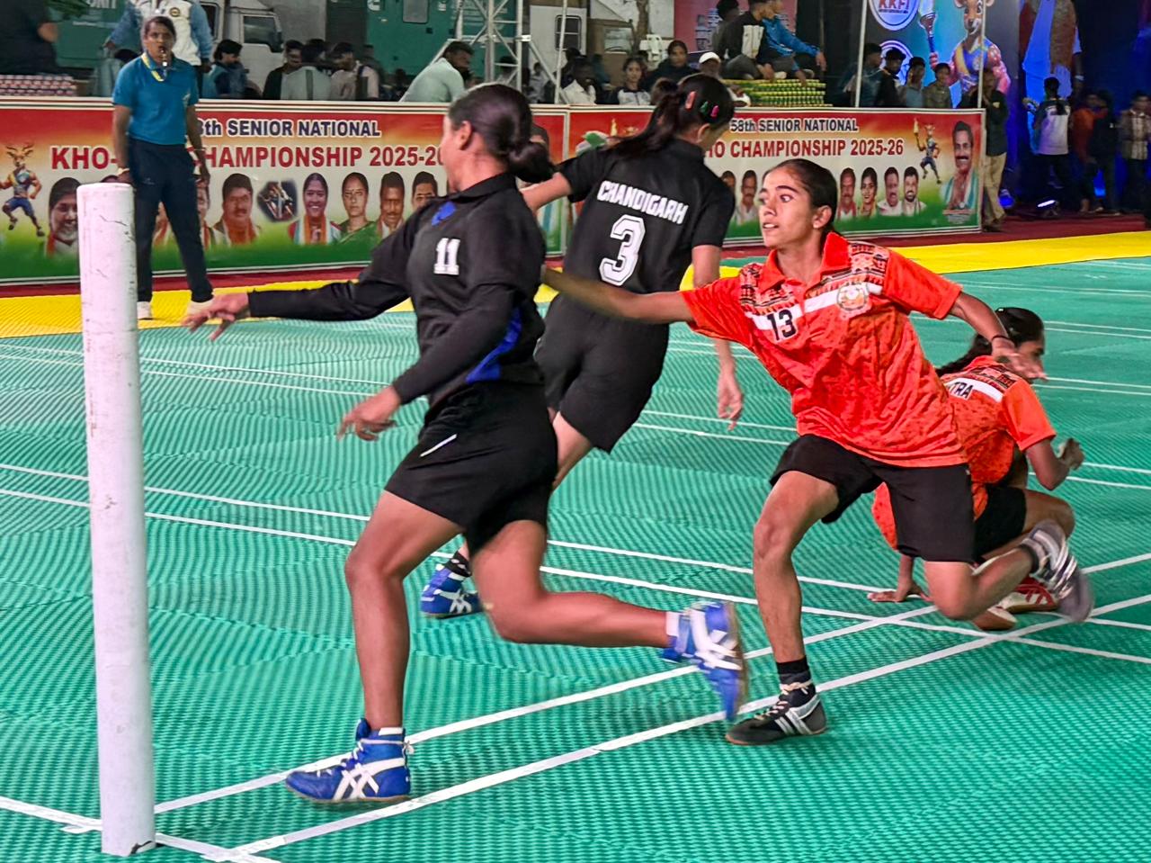 काझीपेठ (तेलंगणा): येथील रेल्वे ग्राउंडवर सुरू असलेल्या ५८ व्या वरिष्ठ राष्ट्रीय खो-खो अजिंक्यपद स्पर्धेने पहिल्याच दिवसापासून प्रेक्षकांची मने जिंकली आहेत. तेलंगणा खो-खो असोसिएशनच्या आयोजनाखाली देशभरातील बलाढ्य संघांनी मैदानात उतरून कौशल्य, वेग, चपळाई आणि रणनीतीचा अफलातून संगम सादर केला. प्रारंभीच्या सामन्यांतच महाराष्ट्र, कोल्हापूर, रेल्वे आणि छत्तीसगड संघांनी जोरदार विजय मिळवत प्रतिस्पर्ध्यांची दाणादाण केली आणि दिमाखात पुढील फेरीत प्रवेश निश्चित केला.