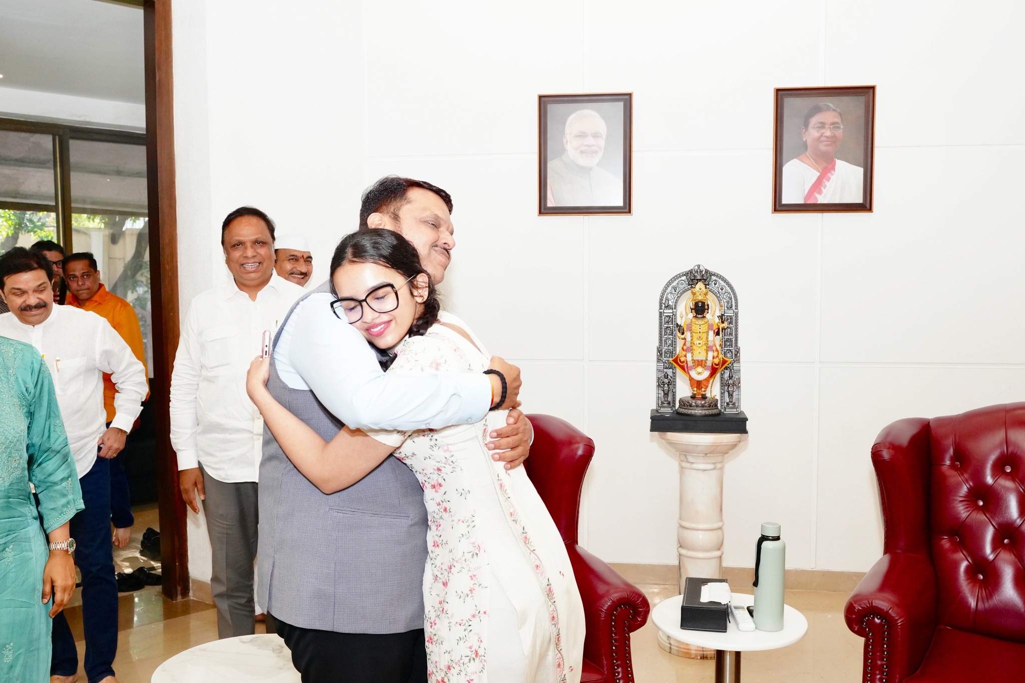 महाराष्ट्रातील २९ महानगर पालिकांमध्ये घवघवित यश मिळविल्यानंतर मुख्यमंत्री देवेंद्र फडणवीसांचे पंतप्रधान नरेंद्र मोदींपासून देशातील सगळ्यांनीच कौतुक केले पण या एतिहासिक विजयानंतर घरी लेक दिविजाने अभिमानाने मारलेल्या या मिठीनंतर फडणवीसांच्या चेहऱ्यावरील अगणित आनंद शब्दात पकडणे कठीण आहे…