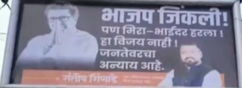 मिरा -भाईंदर : मिरा – भाईंदरमध्ये मनसेने लावलेल्या बॅनरची चर्चा सुरू आहे. त्यात लिहिले आहे की, “भाजप जिंकला, पण मीरा-भाईंदर हरला.” हे बॅनर कालच लावण्यात आले. स्थानिक निवडणुकांनंतर मनसे समर्थकांनी बॅनर लावून म्हटले आहे की, ज्यात भाजपने महानगरपालिकेच्या निवडणुका जिंकल्या असल्या तरी, खऱ्या मुद्द्यांवर आणि विकासावर त्यांचा पराभव झाला आहे.
