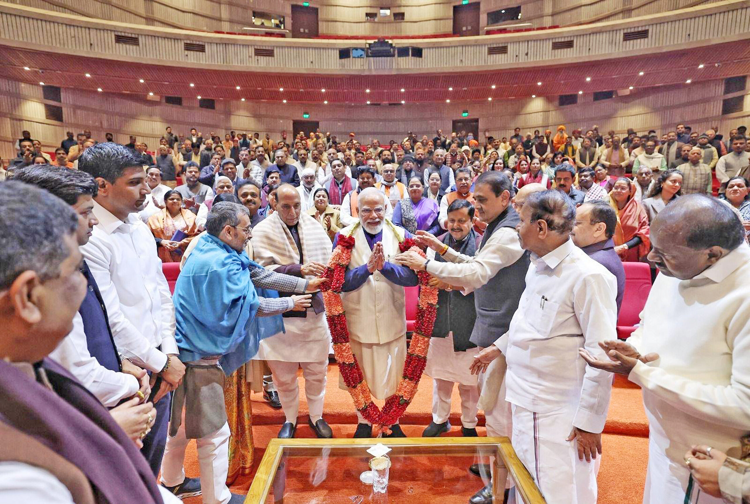 अमेरिकेसोबत यशस्वी व्यापार केल्याबद्दल एनडीएतील घटकपक्षांच्यावतीने पंतप्रधान नरेंद्र मोदी यांचा विशेष सत्कार करण्यात आला. यावेळी एकनाथ शिंदेंच्या शिवसेनेतर्फे श्रीकांत शिंदे, राष्ट्रवादी अजित पवार गटातर्फे प्रफुल पटेलही उपस्थित होते.