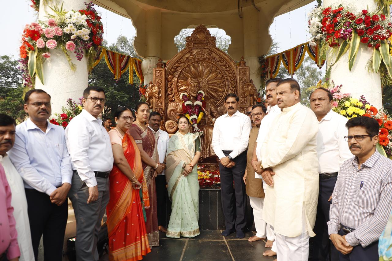 नवी मुंबई : नवी मुंबई महानगरपालिकेच्या मुख्यालयातील अॅम्फिथिएटर येथे छत्रपती शिवाजी महाराज यांच्या प्रतिमेला तसेच पाचव्या मजल्यावरील राजमाता जिजाऊ सभागृहाच्या प्रवेशव्दाराजवळ असलेल्या छत्रपती शिवाजी महाराज आणि राजमाता जिजाऊ यांच्या पुतळ्याला महापौर सुजाता पाटील यांच्या हस्ते पुष्पमालिका अर्पण करून अभिवादन करण्यात आले. याप्रसंगी उपमहापौर दशरथ भगत, आयुक्त डॉ.कैलास शिंदे, अतिरिक्त आयुक्त सुनिल पवार व डॉ.राहुल गेठे, शहर अभियंता शिरीष आरदवाड, प्रशासन विभागाचे उपआयुक्त किसनराव पलांडे, परिमंडळ १ विभागाचे उपायुक्त सोमनाथ पोटरे, मालमत्ताकर विभागाचे उपआयुक्त डॉ.अमोल पालवे, घनकचरा व्यवस्थापन विभागाचे उपआयुक्त डॉ.अजय गडदे, अति. शहर अभियंता अरविंद शिंदे, कार्यकारी अभियंता प्रवीण गाडे, सहा. आयुक्त अनुराधा बाबर आणि इतर अधिकारी, कर्मचारी उपस्थित होते.