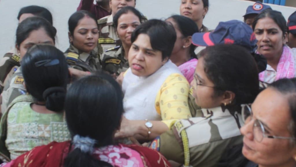 दरम्यान, मंगळवारी खरात याला न्यायालयात आणण्यात येणार होते. त्यावेळी माध्यमांशी बोलताना देसाई म्हणाल्या की, खरातची कृत्ये पाहता त्याच्या कानशिलात लगावायची आहे, यासाठीच मी न्यायालयाच्या आवारात आले आहे. पोलिसांनी गदारोळ होऊ नये यासाठी या ठिकाणी मोठा बंदोबस्त तैनात केला होता. देसाई खरात याला मारण्यासाठी पुढे गेल्या असता पोलिसांच्या ‘दामिनी पथकाने’ त्यांना अडवले. यावेळी देसाई यांनी प्रतिकार करण्याचा प्रयत्न केला असता पोलिसांनी त्यांना ताब्यात घेतले.